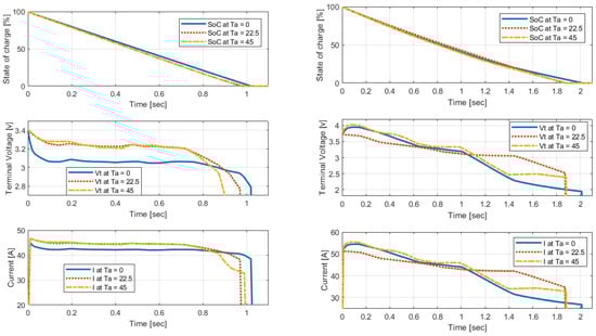 This part examines a similar waveform associated with an EV’s acceleration pedal demand during the acceleration parts of its drive cycles. This waveform can be implemented using a discharge current waveform to demonstrate the effect of the test on the cell temperature. Figure 20 illustrates the random discharge current managed at 0, 22.5, and 45 degrees for LFP and NMC batteries. It also shows the current, SoC, terminal voltage, leakage current, cell temperature, and the entropic coefficient.