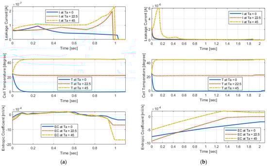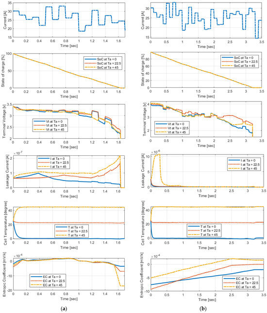 Equivalent resistor test results. The figure as managed under 0, 22.5, and 45 degrees for (a) LFP and (b) NMC for the current, SoC, terminal voltage, leakage current, cell temperature and the entropic coefficient.