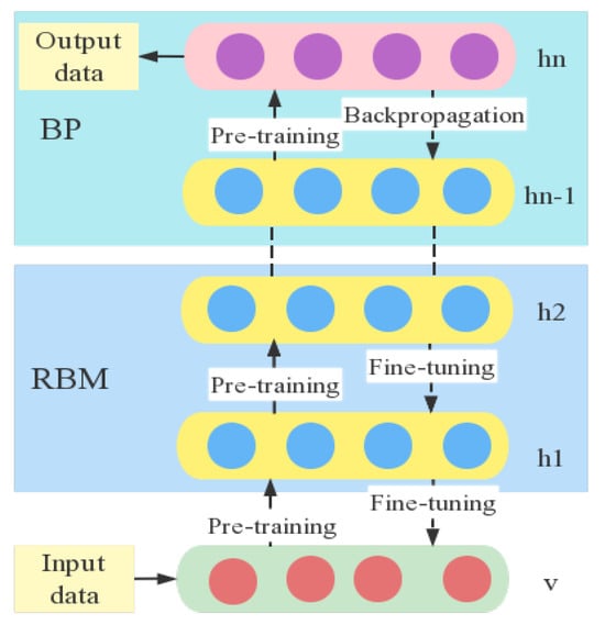 DBN [18] is composed of multiple Restricted Boltzmann Machines (RBMs) [19], with the input layer being an observable variable, and the top layer employing supervised learning via a Back Propagation (BP) Neural Network [20] (see Figure 2). DBN is a probability generation model (see Equation (1)), which is divided into two parts: pre-training and fine-tuning during the training process. In the pre-training stage, the model establishes a joint distribution between the observation data and labels, training the weights between neurons to maximize the likelihood. This enables the entire neural network to generate training data based on the maximum probability. The flexibility of DBN makes it easy to expand and can be used for parallel computation, which is suitable for the identification of dangerous driving behavior.