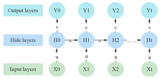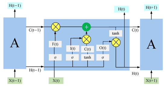 RNN [22] is a type of neural network designed to process sequential data. It works by recursively iterating in the direction of sequence evolution, with all nodes connected in a chain-like structure (see Figure 4). However, RNNs face challenges in capturing long-term dependencies due to the vanishing gradient problem. To solve this problem, Long Short-Term Memory (LSTM) networks were developed. LSTM is a specialized variant of RNNs, which is suitable for processing and predicting important events with relatively long intervals and delays in time series. The key feature of LSTM is its gate mechanism, which helps regulate the flow of information and ensures that important information is retained over time. This mechanism effectively mitigates the problem of long-term dependencies. Figure 5 illustrates the architecture of the LSTM model, where each block “A” represents an LSTM unit. Each unit consists of the input vector X(t), the forget gate F(t), the input gate I(t), Cell State, and the output gate O(t) [23].