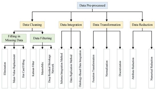After the above data acquisition, the data need to be pre-processed. As shown in Figure 8, the methods of data pre-processing include data cleaning (filling in missing data and data filtering), data integration, data transformation, and data reduction. The methods to deal with missing data include elimination, mean value replacement, and hot card filling. The data filtering methods include the Kalman Filter [55], MentorMix [56], and Deep Residual Shrinkage Network [57]. The method for data integration is to put the data collected by multiple sensors into a database, including the schema integration method, data replication method, and ontology-based data integration. Data transformation uses function transformation, normalization, discretization, etc. Data reduction methods are divided into attribute reduction and numerical reduction. Through the above methods, the collected data are pre-processed according to the needs, and then the data can be input into the deep learning model for dangerous driving behavior recognition.