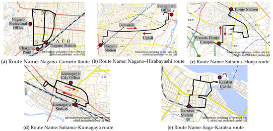 Information related to the past operation using the same vehicle is summarized in Figure 1. Figure 1a is the Nagano–Gururin route, which is a community bus route that circles an 8.5 km route in the central city area in about 50 min, and travels in the order of A, B, … H. Points B, C, and G in the figure are the higher elevation points, with a difference in elevation of ~30 m. Figure 1b is the Nagano–Hirabayashi route. Shuttles are operated on this route of ~11.5 km one-way (~45 min) that links the stop in front of Nagano station to the Nagaden Bus Yanagihara office. As the Nagano station side is ~30 m higher in elevation than that of the Yanagihara office side, the trip from Nagano station is downhill, whereas the return from the Yanagihara office is uphill. Subsequent studies will be conducted on round-trip runs.