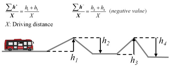 Next, the basic information on each route obtained during actual operation is summarized in Table 2. Here, in addition to the measured electricity consumption values, the following five road/operational indicators that have a significant impact on the same values are included, such as average velocity, start/stop times, stop time ratio, and gained uphill/downhill elevation (Figure 2) [21]. This information shall be used in subsequent studies.