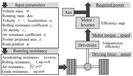 In the simplified method developed in this study, it is necessary to derive the “electricity consumption deterioration rate” as described above, and to acquire this value, a detailed comparison of the “power consumption values when running at a constant velocity on a flat road” and the “power consumption values during actual operation (acceleration/deceleration and hill climbing/descent)” is necessary. Therefore, we constructed a vehicle electricity consumption simulator [16] to derive these two values and analyze the contribution to electricity consumption deterioration. Figure 3 shows a conceptual diagram of the constructed backward simulator. This method, by inputting the vehicle velocity, can be used to obtain the final battery power consumption. The cost values derived by the constructed simulator and the measured cost values are shown in Table 3. The mean error is 2.4%, which was determined to be reasonable.