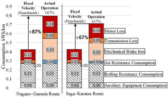 Figure 4 is a comparison of the loss breakdown of the Nagano–Gururin and Saga–Karatsu routes at approximately the same average velocity. Given the road/operational indicators for the two routes (Table 2), the former has a larger number of “start/stop times” and “gained uphill elevation” than the latter, and this leads to an increase in motor/drive unit/mechanical brake loss compared to the latter. These calculation results are considered reasonable. The former also has a higher “stop time ratio,” which has the effect of increasing the maximum velocity and correspondingly worsening the aerodynamic drag. The electricity consumption deterioration rate for both lines is +87% and +67%, respectively.