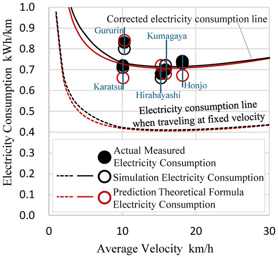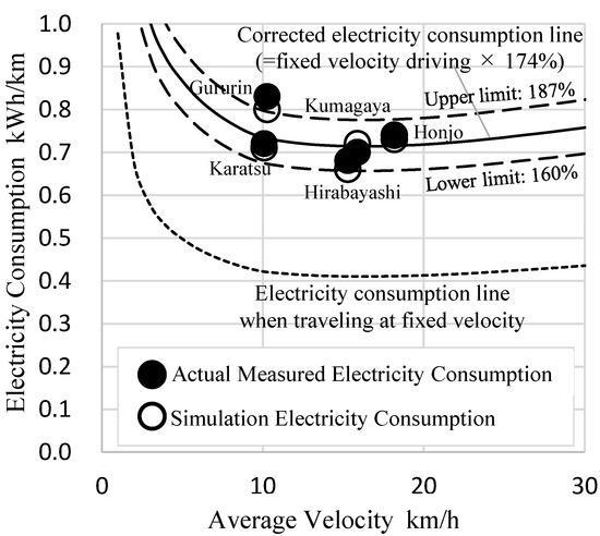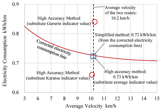 The electricity consumption value (high-accuracy method), as previously described, was obtained by substituting the respective road/operational indicators for each route into Formula (22) (Gururin: 0.84 kWh/km, Karatsu: 0.66 kWh/km) and was found to be 0.73 kWh/km by the simplified method by taking the value on the corrected electricity consumption continuous line. The ideal situation would be obtained if the latter electricity consumption values were representative of the consumption values obtained under the standard road and operating conditions at the same average velocity. Hence, to confirm this situation, we compared the average values of the indicators for the five routes in this study to the consumption values obtained by substituting the average values into the same equation. The electricity consumption value using the same method was 0.72 kWh/km, achieving a good match with the value obtained from the simplified method. This suggests that the electricity consumption values obtained for the average state of the five roads and operations are equivalent to those obtained by the simplified method, thereby demonstrating the utility of the method.