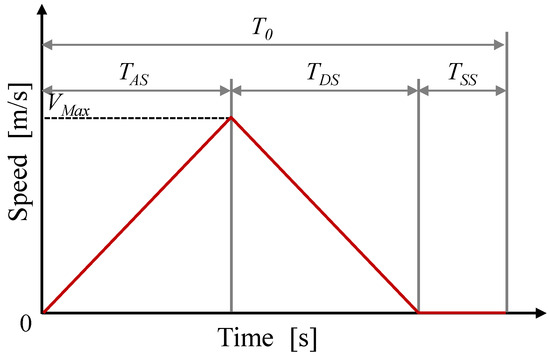 For the theoretical formula constructed here, we added the “start/stop times” and “stop time ratio” to the “average velocity” used in the previous section, making variables of these three information points. These correspond to the road/operational indicators for each route used in Table 2. By introducing the same values, we can reflect the vehicle acceleration and deceleration, which were ignored in the study of the previous section. For generalization, the velocity change monitored in this study is assumed to be a “triangular wave velocity change” [23] (Figure 6). With the same triangular wave as the main trip, this is repeated for the entire route distance.