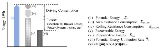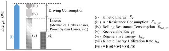 Moving forward, we can formulate the energy consumed by the mechanical brake during deceleration, or “regenerative energy”. When decelerating the vehicle (on flat roads), the operational energy possessed when deceleration starts is used effectively by the drive resistance in the beginning (rolling resistance, air resistance), and the remaining portion, excluding mechanical brake losses and power system losses, is the regenerated energy (to simplify the discussion here, rare cases of deceleration, etc., are ignored). Therefore, in this study, we consider this phenomenon as we define the operational energy usage rate . The same value is the ratio of (iii) aerodynamic drag consumption (effective use)/(iv) rolling resistance consumption (effective use)/(vi) regenerative energy to (i) kinetic energy possessed at the start of deceleration and consisting of the sum of the three (Figure 7).