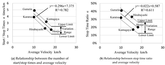 The distribution status of the “start/stop times” indicator and the status of the “stop time ratio” are summarized in Figure 10a,b, respectively. Given the average velocity dependence of the two values, usually they have a negative first-order correlation [24], and the same tendency can be read from the information on the five aforementioned routes.