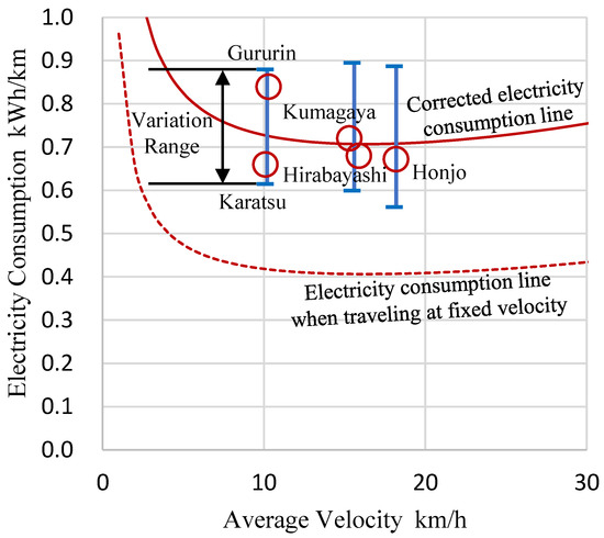 Next, we tried to predict the range of electricity consumption values that would occur in the case of operation in other regions with similar average velocity but where the road and operating conditions were different. Specifically, we first derived the best and worst values for electricity consumption obtained in Formula (22) and then arbitrarily moved the values within the variation range of each of the indicators assumed from the results of the previous study, as shown in Figure 10. Figure 12 shows the results of the study for the three average velocity groups (Gururin and Karatsu routes, Kumagaya and Hirabayashi routes, and Honjo route). The variation range is distributed almost symmetrically in the upward and downward directions of the electricity consumption values obtained from the corrected electricity consumption continuous line; thus, this can be considered appropriate. Furthermore, this range matches that of the maximum error range expected when using the simplified method.