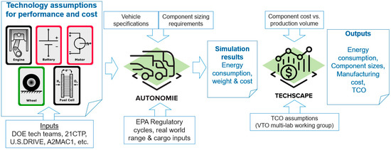 - Cost evaluation: The final step utilizes the TechScape tool to compute the manufacturing cost and total cost of ownership (TCO) of the vehicles. By combining the outputs of Autonomie with cost estimates for advanced powertrain components—such as electric machines and batteries—the TCO analysis provides a comprehensive economic perspective on the potential adoption of advanced vehicle technologies using TechScape [19].