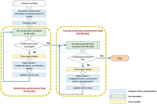 The accurate sizing of vehicle components is essential to ensure that each simulated vehicle meets the performance targets established by the U.S. DOE-VTO. The assumptions outlined in the previous section serve as critical inputs to the vehicle sizing algorithms, which are tailored to each specific vehicle class. These algorithms ensure that vehicles meet key performance specifications, including the 0–60 mph acceleration targets shown in Table 2.