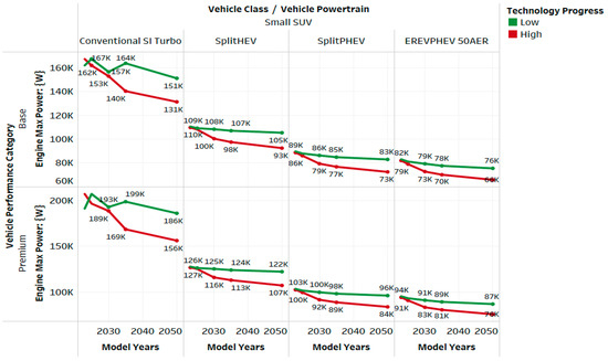 The trend in engine power reduction is consistent across all powertrain types, including conventional, hybrid, and plug-in hybrid vehicles. For example, the engine peak power for midsize SUVs decreases by 10–15% between 2023 and 2050, driven by advancements in lightweight materials and aerodynamic improvements [14,15].