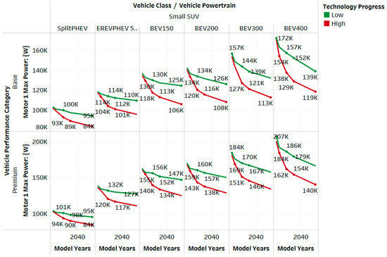 Table 4 summarizes the motor, battery cost, and vehicle MSRP improvements for BEV400 AERs across the simulation timeframes for small SUVs, achieved through advancements in powertrain technologies.