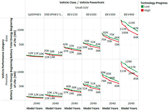In addition to motor and engine sizing, the total energy required by the battery packs in electrified vehicles also declines over time. Figure 5 illustrates the total battery energy required for small SUVs across different electrified powertrains. For example, BEVs with a 200-mile range (BEV200) see a 35% reduction in battery energy requirements by 2050 under the high-progress scenario compared with 2023, reflecting technological advancements in battery chemistry [23,24]. This reduction reaches almost 40% for BEVs with a 400-mile range (BEV400) due to improvements in battery energy density and overall vehicle efficiency [18,23].