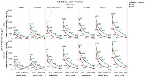 Electric motor costs are expected to decrease significantly over time, as shown in Figure 8. By 2050, the manufacturing cost of electric motors for small SUVs is projected to be 75–82% lower than in 2023, thanks to improvements in manufacturing processes, economies of scale, and material efficiency [11,12]. This trend is consistent across all electrified powertrains, although higher-performance models in the premium category tend to have slightly higher costs due to their more aggressive performance targets.