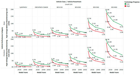 - Manufacturing costs for BEVs and PHEVs decrease significantly, driven by reductions in battery and electric machine costs. By 2050, BEVs are expected to be 10–20% less expensive than conventional vehicles, making them the most cost-competitive option in the small SUV class [14].