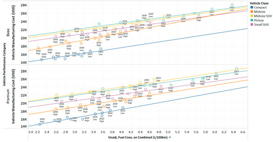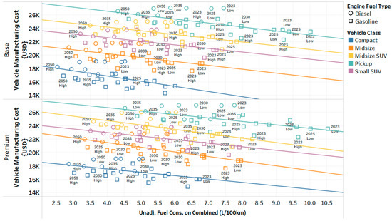 Figure 11 illustrates the manufacturing cost versus fuel consumption for conventional vehicles across various vehicle classes, including compact cars, midsize vehicles, and SUVs. The different-colored lines represent trend lines for each class, showing how these relationships evolve over time. One notable observation is that diesel vehicles tend to have higher manufacturing costs compared with gasoline-powered vehicles, primarily due to the increased cost of diesel engines and after-treatment systems [1,9].