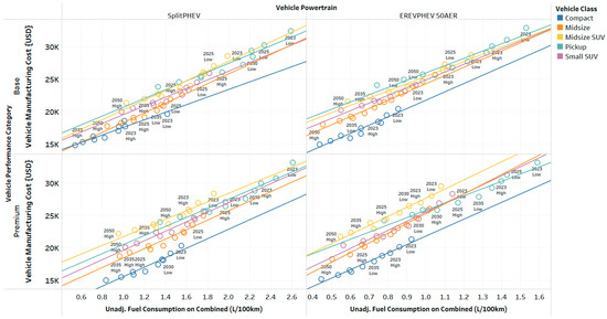 For plug-in hybrid electric vehicles (PHEVs), the analysis shows a sharp reduction in both fuel consumption and manufacturing costs over time. As shown in Figure 13, the improvements in component efficiency, particularly in electric machines and batteries, contribute to this reduction. PHEVs with higher all-electric ranges (AERs) exhibit a more significant drop in fuel consumption, but this comes at the expense of higher initial manufacturing costs due to larger battery packs. However, these costs are expected to decline substantially by 2050, owing to continued advancements in battery technology [18,23].