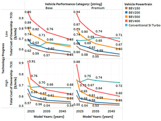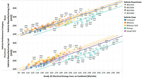 Finally, for BEVs, the battery’s usable energy capacity of the battery pack was calculated to meet the vehicle’s combined driving cycle mileage as defined by EPA sticker values. This approach ensures consistency in assessing performance while accounting for advancements in battery energy density and manufacturing efficiency [20,21].