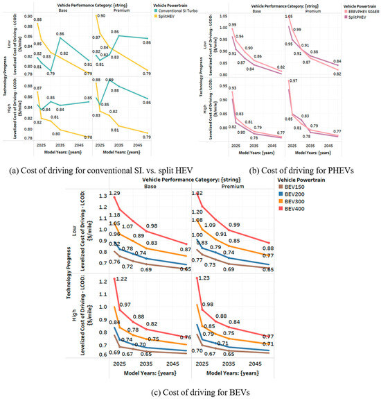 Plug-in hybrid electric vehicles (PHEVs) also exhibit a declining LCD, with the most substantial reductions occurring in models with higher AERs. For instance, PHEVs with a 50-mile AER experience a 30–40% reduction in the cost per mile driven by 2050 compared with 2023. This reduction is driven by the lower cost of electricity and the decreased reliance on gasoline as battery technology improves [6,8].