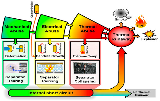 - Lai, X.; Jin, C.; Yi, W.; Han, X.; Feng, X.; Zheng, Y.; Ouyang, M. Mechanism, Modeling, Detection, and Prevention of the Internal Short Circuit in Lithium-Ion Batteries: Recent Advances and Perspectives. Energy Storage Mater. 2021, 35, 470–499. [Google Scholar] [CrossRef]
