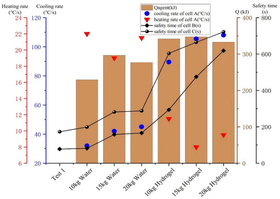 - Liu, C.; Zhang, G.; Yuan, D.; Jiang, L.; Fan, Y.; Kong, D. Experimental Study on the Efficiency of Hydrogel on Suppressing Thermal Runaway Propagation of Lithium-Ion Battery. Fire Technol 2024, 1–22. [Google Scholar] [CrossRef]
