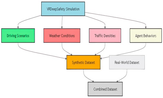 As shown in Figure 1, VRDeepSafety generates a comprehensive training dataset by combining synthetic and real-world data. The VRDeepSafety simulation engine creates synthetic data by varying four key parameters: driving scenarios, weather conditions, traffic densities, and agent behaviors, enabling the simulation of a wide range of realistic driving situations. Specifically, the synthetic data, which contains sensor data, as well as ground truth (GT) V2X data (e.g., locations, velocity, and IDs of other vehicles, pedestrians, and infrastructure), is used to augment the real-world dataset, which contains only sensor data. This combination provides the VRFormer model with more comprehensive input for training. In detail, the augmented data are created by using the feature space generated from real-world sensor data as a basis and appending the synthetic data, so that the positional data from a real-world LiDAR point cloud are augmented with the GT positional data from the V2X simulation. This is conducted for all sensor data and the V2X data. This fusion approach ensures that the trained VRFormer model is robust and generalizable, by leveraging real-world sensor data, as well as providing the model with access to GT data, which would otherwise be difficult to access, and allows for a consistent format between both datasets. The rationale behind this method is to leverage the realism of the simulated data alongside the GT of the V2X data.