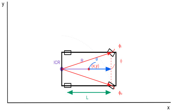 Figure 2 illustrating Ackermann steering geometry. The vehicle’s position is defined by its center of gravity (CG) in the coordinate system. The heading () is the angle between the longitudinal axis (blue arrow) and the X-axis. Ackermann steering ensures no tire slippage by having the inner and outer front wheels rotate around a common instantaneous center of rotation (ICR—purple dot), connected by red lines. The turning radius (R—solid red line) is the ICR-CG distance. The wheelbase (L—green double arrow) is the inter-axle distance. The dotted gray arc depicts the vehicle’s path. This geometry is essential for accurate kinematic modeling in VRDeepSafety. We simplify the model using an average steering angle as in Equation (3), where the heading rate depends on speed , wheelbase , and steering angle . This simplification enables efficient computation without losing core kinematic characteristics.