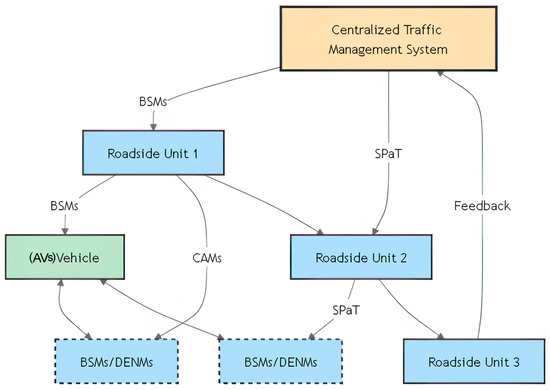 where represents the information flow from infrastructure unit (such as traffic lights, road signs, or connected intersections) to vehicle . These matrices are typically sparse due to the localized nature of the communication. To optimize bandwidth and computational resources, data prioritization techniques are used. For instance, critical messages such as collision warnings or sudden braking events are given higher priority than less critical updates.