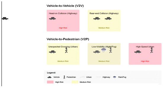 The adoption of V2X communication technologies is widely regarded as a promising development for improving road safety and reducing traffic accidents. V2X protocols enable vehicles to exchange information with each other (V2V), with roadside infrastructure (V2I), with pedestrians (V2P), and with other elements of the traffic ecosystem and, by enabling real-time data exchange, enhances situational awareness and provides quicker and more effective reactions to potential threats. Khalil et al. [15] describe how V2X improves safety by enabling vehicles to share vital information like position, speed, and heading with other vehicles and nearby infrastructure, improving reaction time and reducing the likelihood of accidents.