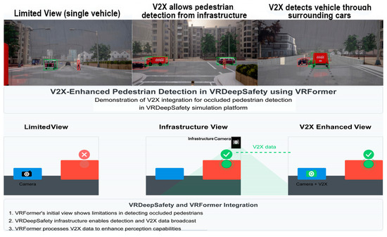 This paper introduced VRDeepSafety, a novel VR simulation platform for autonomous vehicles, and its integrated deep learning model, VRFormer. Our results demonstrate that VRDeepSafety, through its unique integration of realistic V2X communication and multi-modal data generation, overcomes limitations of existing datasets and allows for more robust testing. VRFormer achieved an 85% average prediction accuracy (APA) for accident prediction within a 2 s horizon, a 17% improvement in 3D object detection precision, and a 0.3 s reduction in response time compared to a single-vehicle baseline. Furthermore, V2X integration increased prediction accuracy by 15%. We observed a trade-off between prediction horizon and accuracy, with accuracy decreasing to 70% at a 3 to 4 s horizon, highlighting the importance of multi-agent systems and comprehensive V2X data. Importantly, initial Sim2Real transfer learning experiments, where VRFormer was fine-tuned with real-world data from the nuScenes dataset, showed promising results, indicating the potential for real-world deployment and generalization. This innovative approach reveals the limits of single-vehicle systems and opens opportunities for more robust autonomous vehicle development. Future research will optimize prediction horizons, assess various V2X protocols, explore adaptive system designs to fully realize the potential of V2X, and further refine the Sim2Real transfer-learning process to maximize real-world performance. VRDeepSafety’s groundbreaking testing platform has the capacity to accelerate the development of safer and more reliable autonomous vehicles.