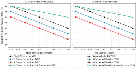 Figure 16 shows the impact of (a) pose noise (meters) and (b) communication latency (seconds) on VRFormer’s APA. Pose noise was simulated using a Gaussian distribution (standard deviation 0.02 m). VRFormer’s performance was evaluated in a single-vehicle scenario (no V2X) and three multi-agent V2X scenarios (three, four, and four vehicles + infrastructure). Increasing noise or latency decreases APA. However, V2X consistently improves VRFormer’s robustness (higher APA). Adding infrastructure to the four-vehicle scenario consistently yields the best results. Especially, at 0.1 m pose noise, VRFormer with four vehicles + infrastructure achieves 43.6% APA—1.5% and 3% better than three vehicles and the single-vehicle baseline, respectively. VRFormer exhibits similar APA gains at 0.1 s latency (approximately 1.1%, 1.8%, and 2.5% improvement for the three-vehicle, four-vehicle, and four-vehicle + infrastructure scenarios, respectively, compared to the single-vehicle baseline). This increased robustness, however, comes at the cost of increased latency. Compared to the single-vehicle case, the three-vehicle, four-vehicle, and four-vehicle + infrastructure scenarios add approximately 0.05, 0.1, and 0.15 s of latency, respectively, at 0.1 m pose noise. Therefore, balancing robustness, accuracy, and responsiveness is critical when designing V2X systems with deep learning.