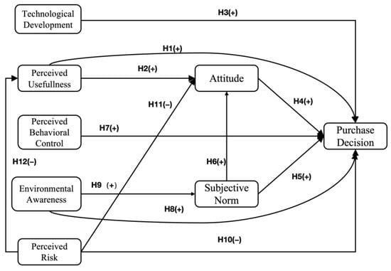 TAM is a theoretical framework used to explain the extent to which individuals adopt new technologies. It posits that perceived usefulness and perceived ease of use are critical factors influencing an individual’s decision to adopt a particular technology and whether they continue to use it. The existing literature often simplifies the TAM by overlooking certain variables. For instance, Adu-Gyamfi [8] argued that consumers may lack actual experience with electric vehicles, leading to the omission of perceived ease of use. Given that many consumers may have limited knowledge and experience with battery-swapping technology, this study similarly omits perceived ease of use and quantifies perceived usefulness through factors such as vehicle condition perception, battery-swapping station location perception, battery-swapping station charging-status perception, predictive maintenance perception, and user feedback perception. Drawing from common assumptions in the existing literature [9,10], we propose the following hypotheses: