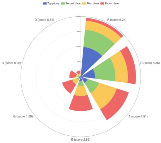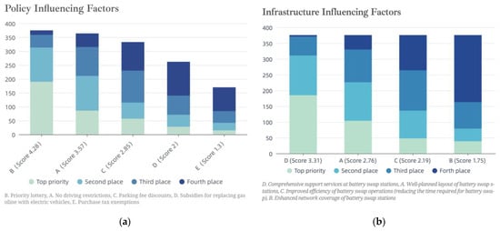 In order to thoroughly explore consumers’ understanding of the battery-swapping model and the emphasis on functionality, external factors such as policies, costs, infrastructure development, and other factors affecting consumers’ purchasing intentions will be discussed sequentially in relation to the ranking questions involved in the aforementioned aspects. Statistics suggest that when calculating the average composite score, different weights should be assigned to each variable, known as weights; the average calculated rationally according to these weights is termed the weighted average. In ranking questions, due to variations in the importance of options, weighting is necessary. It is calculated based on the order in which respondents make their choices, thereby reflecting the comprehensive ranking of options, with higher scores indicating greater favorability and preference among consumers. The calculation method is as follows: the comprehensive score of options = (Σ frequency × weight)/number of respondents for the question, where the weight depends on the order in which the options are ranked by the respondents. In this study, there are four options involved in the ranking, with a weight of 4 for the first position, 3 for the second position, 2 for the third position, and 1 for the last position.