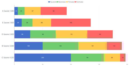 As depicted in Figure 3, it is evident that in terms of the emphasis on battery-swapping content (A for battery leasing and service fees, B for battery safety concerns, C for the service radius of battery-swapping stations, D for the duration of a single battery-swapping service, and E for the down payment on battery-swapped vehicles), consumers prioritize the following four aspects in the order of C > B > D > E, with scores of 4.25 > 3.59 > 2.93 > 1.93.