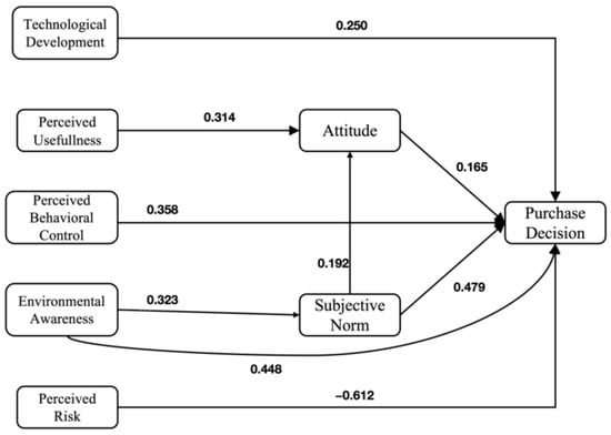 Furthermore, within the extended TPB framework, the path coefficients between attitudes, perceived behavioral control, subjective norm, and the purchase decision of battery-swapping EVs were found to be 0.165, 0.358, and 0.479, respectively. All three paths passed the significance test at a 5% level, indicating that consumers’ intuitive evaluations of battery-swapping models, their perception of control over acquiring battery-swapping EVs, and the social environmental factors they consider when making a purchase decision all have a significant positive impact on their purchase decisions. This confirms the validity of hypotheses H4, H5, and H7.