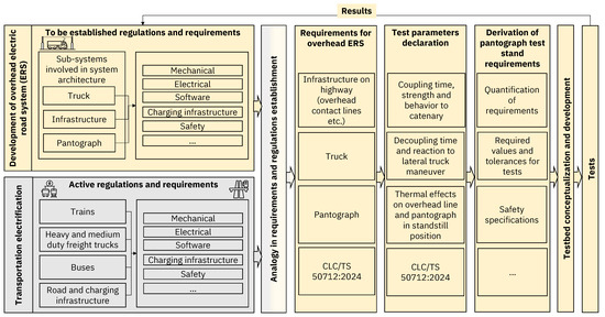 In product development, it is essential to define a complete, unambiguous, and contradiction-free target system [47]. Various design process models have been created as a means to support designers for planning and documenting their work. Here, we followed a process model described in [48]. Although the overhead ERS is a newly developed technology, it is based on technology used in electric railways. Logically, standards and requirements do not have to be developed from scratch but can be derived from analogies between these applications. Our approach for deriving the requirements for the ERS is illustrated in Figure 2: