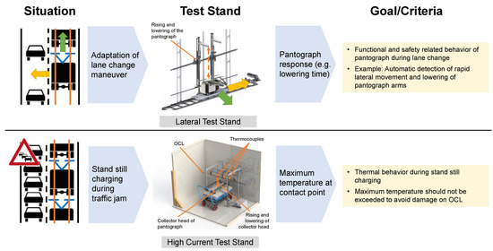 Based on these requirements, two test stands were designed. The “lateral test stand” deals with the behavior of the pantograph before, after, and during the coupling with the overhead contact lines (OCLs). It also examines the decoupling behavior resulting from regular disconnection as well as lateral maneuvers, such as lane changing on the highway.