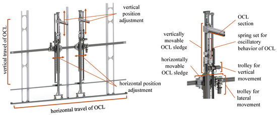 The design of the lateral test stand can be divided into two parts. One is the design of the overhead contact line (OCL) module, which is laid out to replicate different OCL suspension conditions. The OCL heights listed in Table 1 Index R5 and the vertical and horizontal distance differences between the two overhead contact lines listed in Table 1 Index R6 are implemented in the form of two OCL modules. In our design (Figure 4), each OCL module can be individually moved vertically and horizontally. Additionally, spring sets are integrated to simulate OCL tension and, thus, oscillatory behavior during coupling of the pantograph. Sensors to check if the contact force is in the permissible range that is listed in Table 1 Index R2 are implemented.