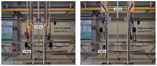Constructed lateral test stand with low and closely spaced OCLs (left) and high and widely spaced OCLs (right). The denoted dimensions are the maximum and minimum distances to be tested. (Dimensions are not to scale).