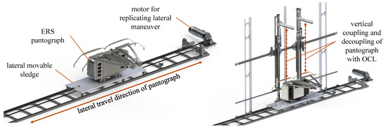The second part of the lateral test stand is designed to move the pantograph laterally with accelerations that are listed in Table 1 Index R3. The pantograph is placed on a sledge that is moved along a rail installed in the lateral direction, as illustrated in Figure 6. Using this configuration, the decoupling behavior of the pantograph as a response to the lateral maneuvers that are listed in Table 1 Index R3 can be observed. A supervised infeed circuit with a corresponding interface must be devised to measure and prove the functionality of the pantograph in response to requests sent from the operating system (the vehicle in real-world applications).