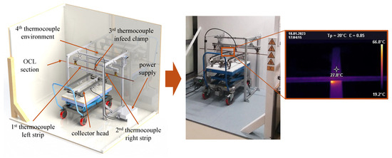 The high-current test stand illustrated in Figure 7 is designed and built to determine the maximum electric current from the overhead contact line (OCL) to the pantograph. The temperature of the OCL should not exceed the limit listed in Table 1 Index R4. A constant contact force corresponding to the permissible static contact force range listed in Table 1 Index R2 must be applied to the collector head during the test. Both optical and tactile measurement methods are used to monitor the heating process. By placing several thermocouples at suitable points on the OCL and in the ambient air, the OCL temperature is measured and recorded. To verify the thermocouple measurements, the radiant energy of the OCL is measured with a thermal imaging camera. In order to meet the data quality requirements, the measurement methods used in this study were first tested and then verified. For this purpose, a special calibration station was developed (Figure 8), which allowed precise control of the situational boundary conditions through the targeted use of heating elements.