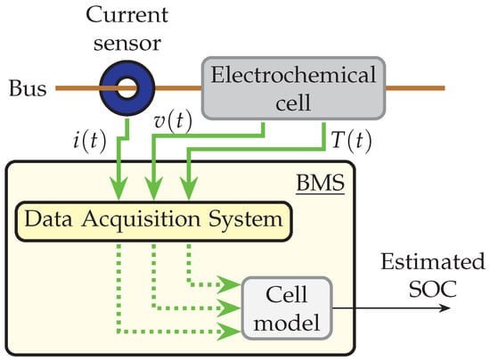 Electric vehicles’ operation requires constant updates for the following: (1) the energy available in the battery pack (which directly correlates with the remaining driving range), and (2) the power capabilities (which determine the rate at which energy can be withdrawn from the battery without exceeding the safety limits set by the manufacturer) [4]. Thus, three key battery performance parameters emerge: SOC, state of health (SOH), and state of power (SOP). Energy and power cannot be measured directly due to the lack of a sensor capable of making such a measurement. For that reason, these quantities must be estimated using measurements of voltage , current , and temperature [5] (see Figure 1).