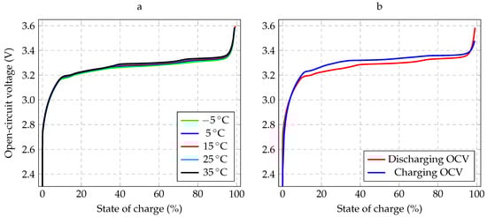 An additional challenge to estimate SOC is the OCV hysteresis (see Figure 3b). This phenomenon has been well documented in many battery types like nickel–metal hydride (NiMH) cells [25,26] and in lithium-ion chemistries like lithium iron phosphate (), and lithium titanate () [27]. The hysteresis effect describes a significant difference in the OCV at a given SOC after reaching equilibrium, depending on whether the battery was previously being charged or discharged. This effect is mostly generated by mechanical stress [28,29], thermodynamic effects in the electrode potentials [30], and the varying lithium insertion rates into the particles within an electrode [27]. The magnitude of hysteresis may depend on the type of chemistry employed. For example, for lithium-ion battery cathodes consisting of nanosized doped , a value of approximately 7 mV of hysteresis was reported in [27]. According to [30], the hysteresis voltage can extend from a few millivolts in lithium cobalt oxide () to several tens of millivolts in lithium iron silicate () and titanium dioxide () cathodes. Consequently, a basic OCV-SOC relationship without accounting for hysteresis effects can lead to larger SOC estimation errors [31].