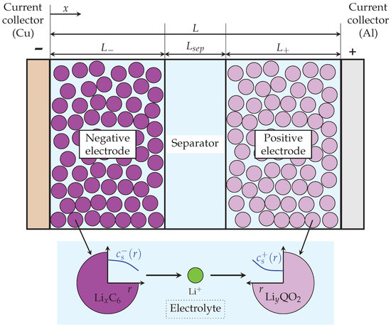 The 1D electrochemical model consists of four PDEs describing the conservation of charge in the electrolyte phase (), the conservation of charge in the solid phase (), the concentration of lithium in the electrolyte phase (), and the concentration of lithium in the solid phase () [43,54,55]. These equations are presented next: