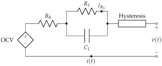 Equivalent circuit models use electronic components (resistors, capacitors, and voltage sources) to build a circuit network capable of describing the terminal voltage of the battery taking into account the current profile applied to the cell to parameterize the model [4,7]. The equations describing the circuit detail with precision various dynamic behaviors of the battery. The simplicity and robustness offered by ECMs constitute the main reasons for being widely used in a BMS to estimate the SOC. One of the most used ECMs is the enhanced self-correcting (ESC) cell model [4] illustrated in Figure 5. The OCV as a function of the SOC is represented by a voltage-dependent source. The cell current is represented with the notation ; in discharge processes, and on the contrary, when the cell is being charged; is the cell terminal voltage and represents the diffusion current flowing through the resistor . The series resistance describes the internal resistance of the electrochemical cell. Lithium diffusion processes in lithium-ion cells result in a voltage that changes slowly when current is applied or demanded from the cell. To approximate this behavior, a parallel network is included in the model, where the diffusion voltage will be represented by the voltage associated with the resistor [54]. Finally, a block called “Hysteresis” describes the hysteresis in the terminal voltage commonly observed in lithium-ion and NiMH cells.