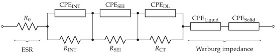 - and symbolize the layers of the SEI at the interfaces between the electrolyte and the electrodes [70]. These components account for the resistive and capacitive effects of the SEI, which influence ion transport and charge transfer during battery operation;