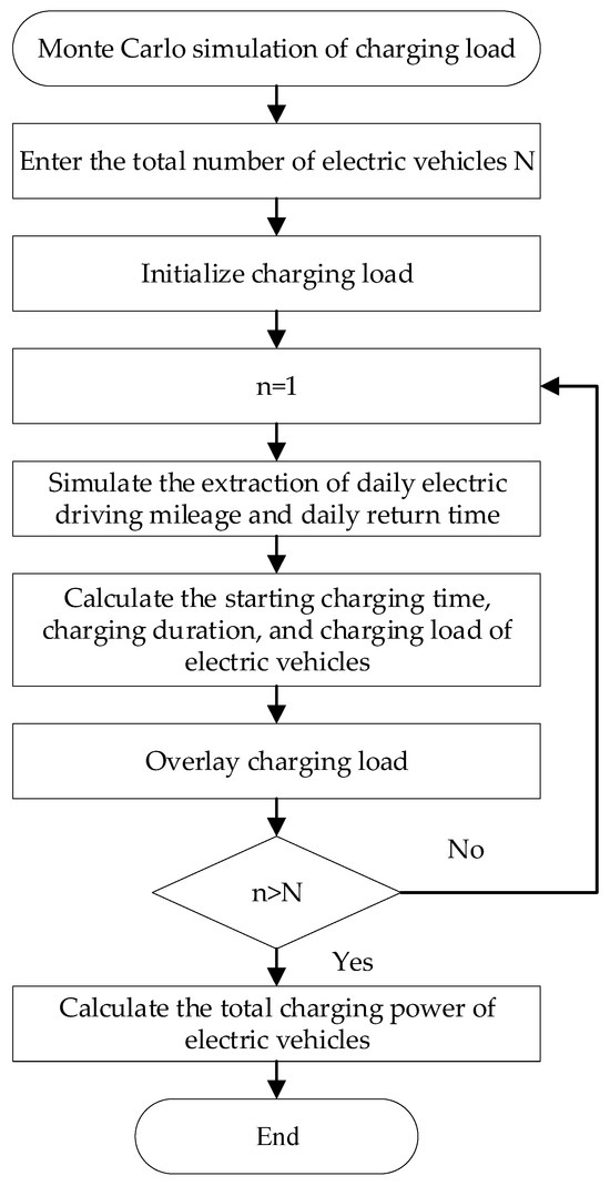 Figure 1 shows a flowchart of the MC simulation of the CL for EVs. (1) First, we input the total number of EVs in the regional PG and initialize the CL. (2) We then use the MCA to extract EVs’ return time and daily mileage. (3) We calculate the remaining SOC of EVs before charging based on daily mileage, consider the return time as the charging start time, and calculate the charging time required to reach the desired charge. (4) We then calculate the CL of each EV based on its starting power and charging duration and add up all the CLs of the EVs to obtain the total CL of the EVs. (5) Finally, we add the total CL to the original base load to obtain the current total PG load.