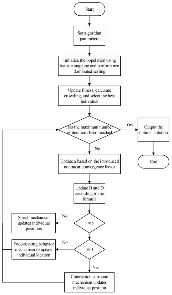 The INSWOA uses LCM for population initialization, improving the algorithm’s global optimization ability. Introducing a nonlinear convergence factor during the position update phase is beneficial for exploring better solutions around the current optimal solution in a targeted manner; introducing adaptive inertia weights based on population diversity during the stages of bubble net hunting and trapping can effectively improve the quality of solutions, population diversity, and the convergence efficiency of algorithms, achieving a dynamic balance between local exploitation and global search. Because there are two optimization objective functions in this paper, it is not possible to minimize both optimization objectives through optimization. Therefore, a compromise solution needs to be found to achieve the best combination of the two optimization objectives. The specific steps of the INSWOA are as follows: (1) Set various algorithm parameters, input initialization data based on the EV charging model data. (2) Initialize the population through logistic mapping, generate an initial population, and perform non-dominated sorting. Calculate the fitness for each individual and find an optimal position to preserve. (3) Update and then update B and D according to Equation (4). If the probability p is below 50%, go to step (5). Otherwise, update the position using Equation (24). (5) Check whether the absolute value of the coefficient vector B is less than 1. If it is, use Equation (17). If not, perform a global random search for prey and update the position based on a randomly selected individual. (6) Once a maximum iteration count is reached, output a Pareto solution set that satisfies the constraint conditions. Otherwise, return to step (3) and repeat until the output conditions are fulfilled.